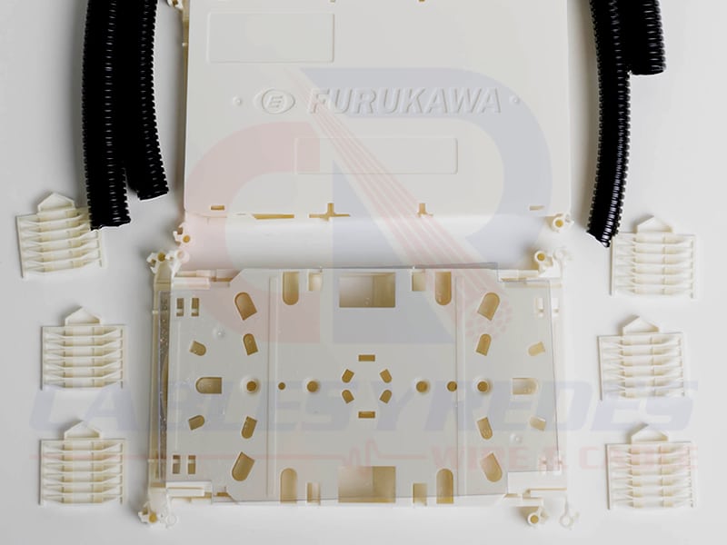 Conjunto de accesorios para acomodar los empalmes por fusiones ópticas en las bandejas de fibra óptica o distribuidores ópticos. El conjunto es constituido por bandejas de empalme, protector de película de plástico, tornillos, protectores de empalme e abrazaderas de plástico para la fijación de los cables.