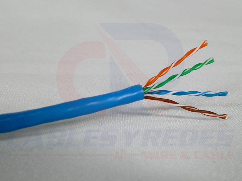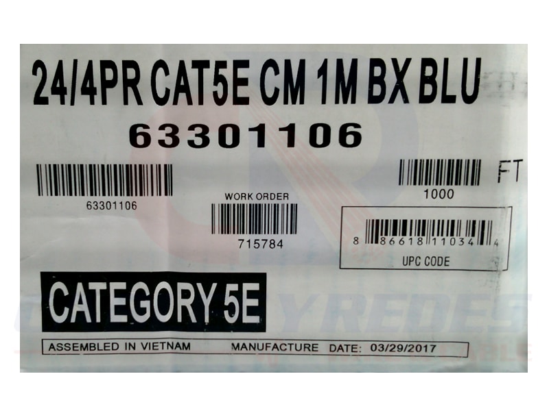 La bobina de cable Cat5e UTP, tiene un color azul y una longitud total de 305 metros. El calibre del cable es AWG 24 y la frecuencia máxima que soporta es de 350 MHz. El forro está fabricada con cloruro de polivinilo (PVC) y el blindaje del cable es U/UTP (UTP). Este tipo de cable no cuenta con conectores en ninguno de sus extremos, por lo que se debe realizar su instalación manualmente.