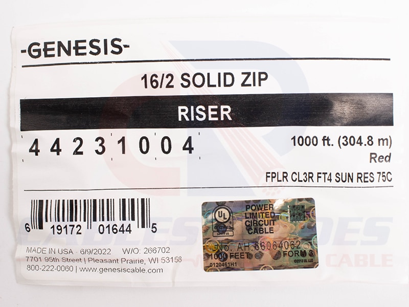 GEN-44231004 Genesis Fire Alarm Zipcord 2Cond 16AWG FPLR/Cl3R