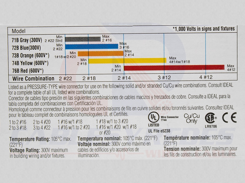 Con un resorte de alambre cuadrado fijo y una carcasa de agarre positivo, Wire-Nut® es perfecto para girar con los dedos para una conexión segura y duradera. La gama de cables refinada la convierte en la mejor opción para aplicaciones de cables trenzados finos. Wire-Nut® también cuenta con una carcasa termoplástica resistente e ignífuga que resiste condiciones ambientales extremas y es reutilizable para facilitar cambios y adiciones de circuitos.